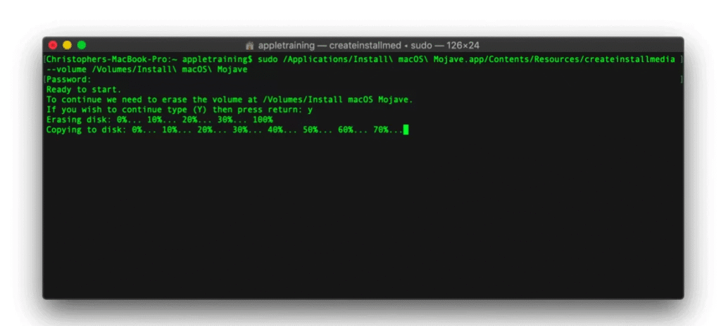 sudo /Applications/Install\ macOS\ Mojave.app/Contents/Resources/createinstallmedia --volume /Volumes/Install\ macOS\ Mojave