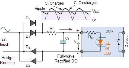 Bridge rectifiers convert a sinusoidal voltage into full-wave rectified pulses at twice the input frequency. The problem here is that these voltage pulses start and end from zero volts which means that they will fall below the minimum turn-on voltage requirements of the SSR’s input threshold causing the output to turn “on” and “off” every half cycle.